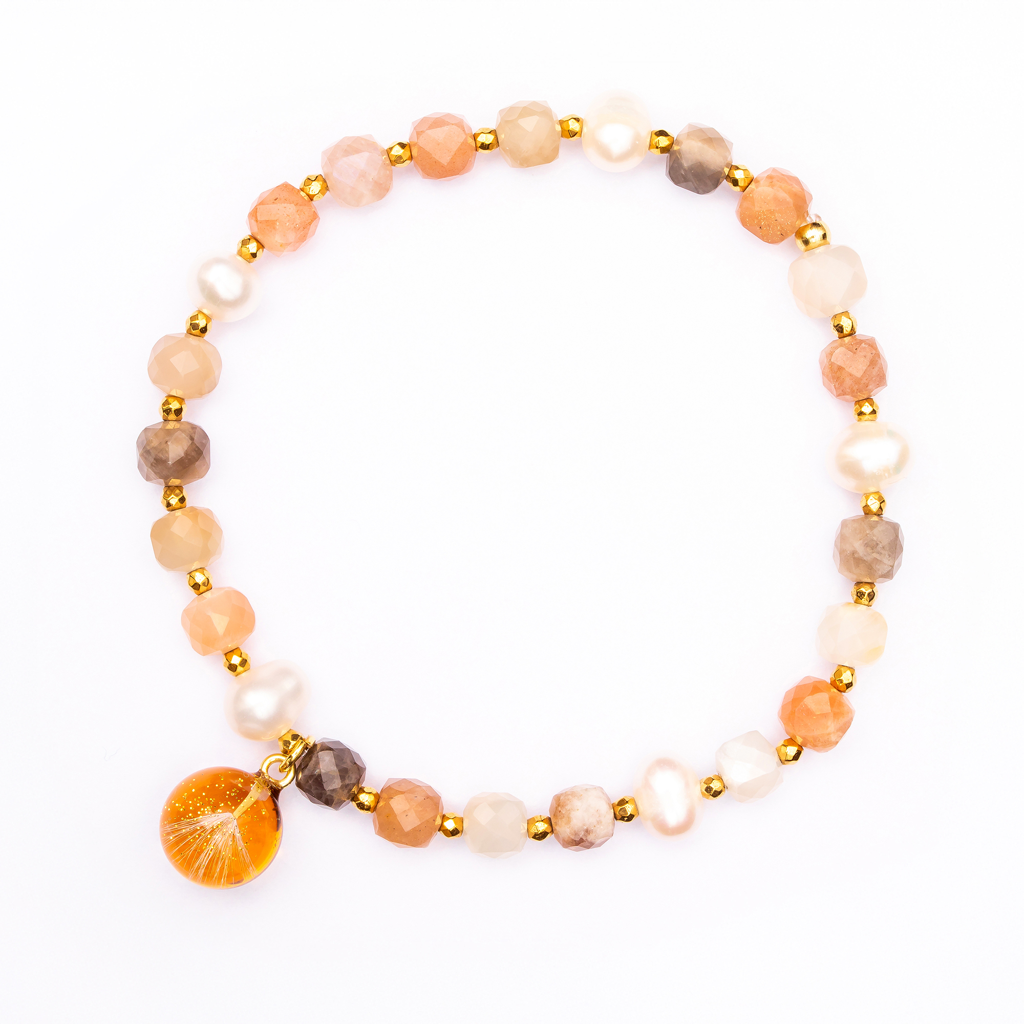 Produkt: Bransoletka z kamieniem słonecznym i perłą oraz nasionami dmuchawca zatopionymi w żywicy