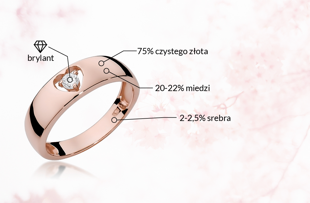 Różowe złoto to stop złota (75% czystego złota), miedzi (20–22,5%) z często niewielką domieszką srebra (2,5–5% srebra). To miedź nadaje biżuterii ów charakterystyczny różowy odcień. Im więcej jest miedzi – tym bardziej intensywny kolor. Srebro z kolei sprawia, że jest on jaśniejszy, bardziej delikatny. Miedź dodatkowo powoduje, że biżuteria jest bardziej twarda (czyste złoto jest bardzo miękkie) i odporna na wszelkiego typu zarysowania.
